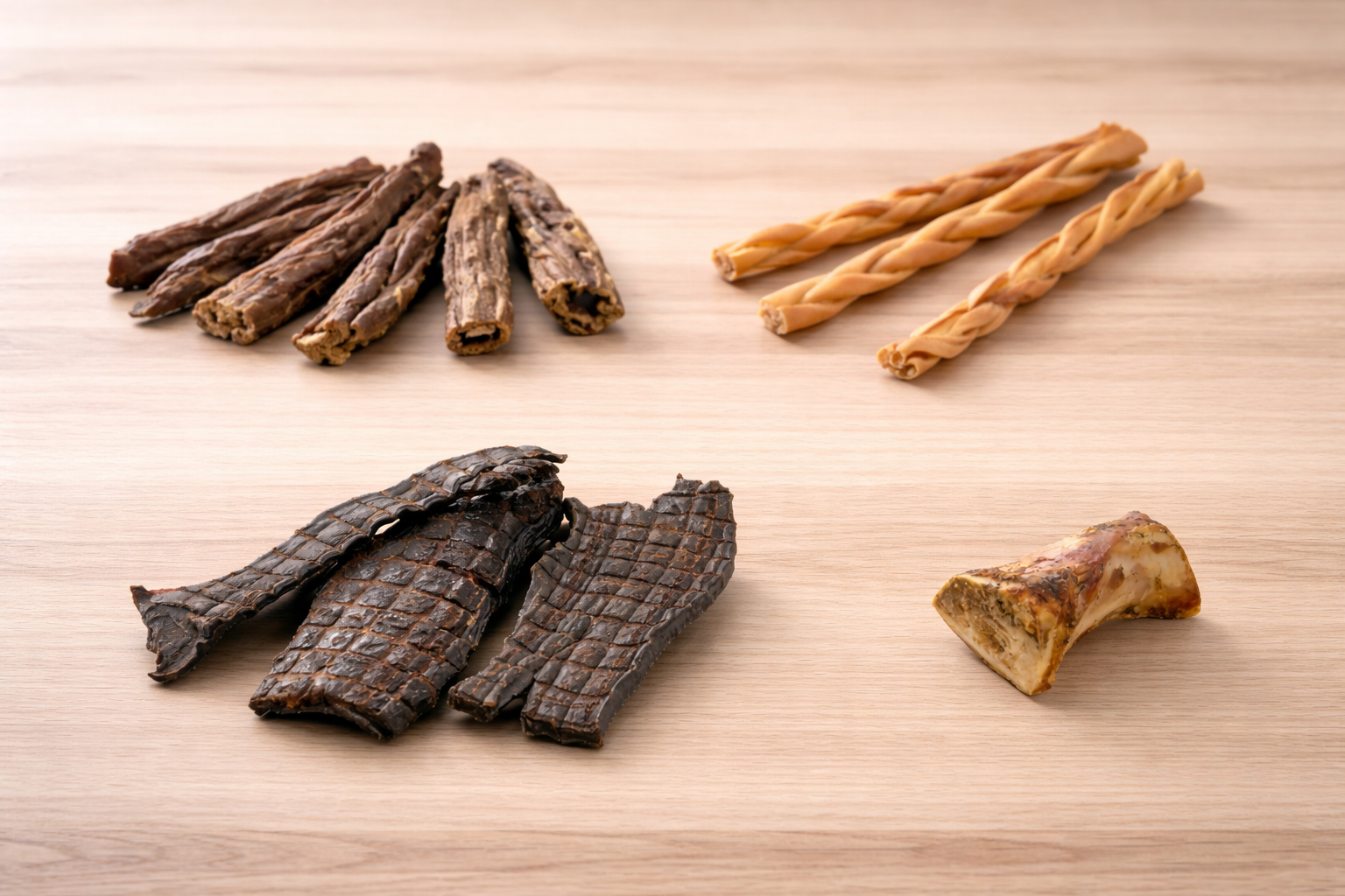 Das Sortiment reicht von getrockneten Fleischprodukten wie Trockenfleisch und Innereien bis hin zu Knochen – geeignet für kleine bis große Hunde. Alle Kauartikel werden schonend verarbeitet und kommen ohne künstliche Zusätze aus.