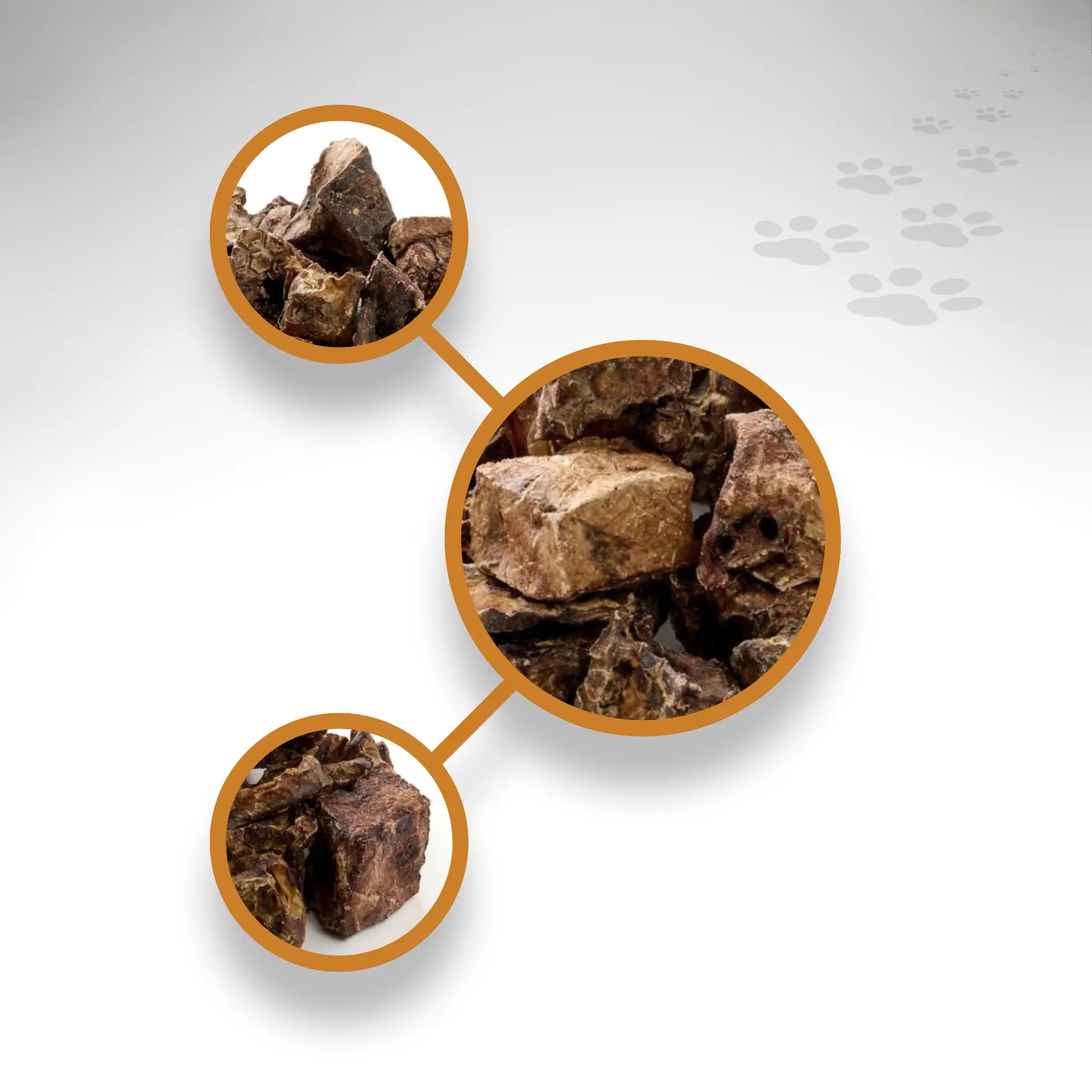 Lungengewebe hat von Natur aus eine schwammartige Struktur mit vielen kleinen Luftkammern, wodurch die Würfel trotz ihrer Nährstoffdichte besonders leicht verdaulich sind und sich perfekt für häufige Belohnungen eignen.Bitte beachten: